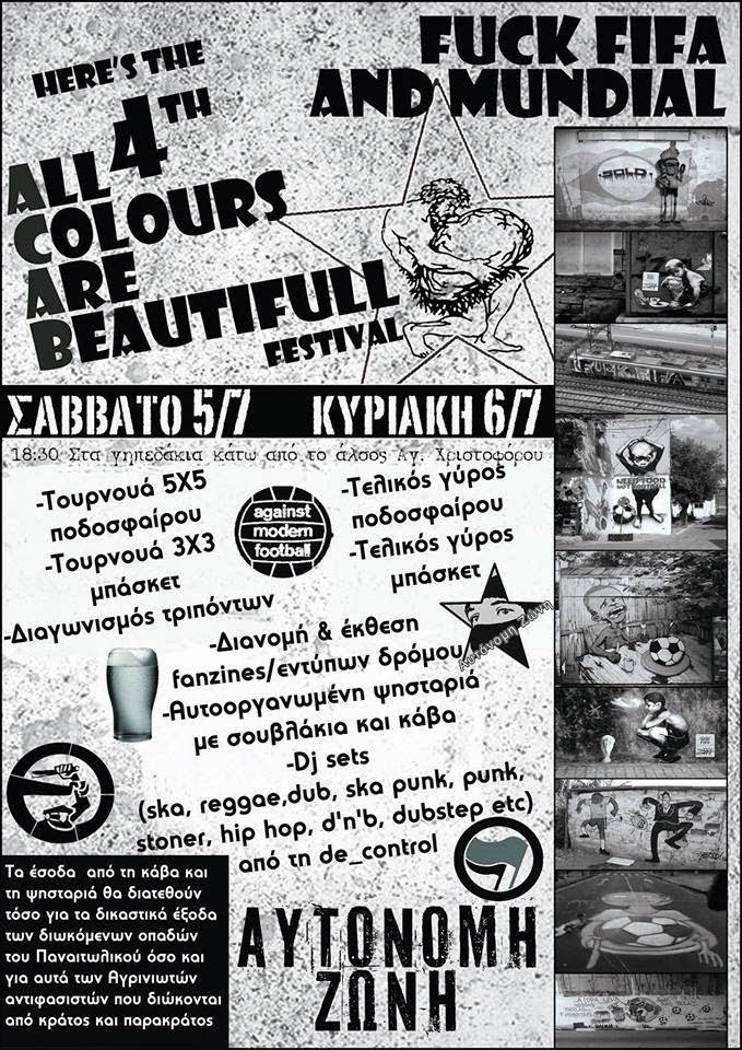 Το διήμερο 05-06 Ιουλίου θα πραγματοποιηθεί το 4ο καθιερωμένο πια All Colours Are Beautiful festival του group της Αυτόνομης Ζώνης. Ένα φεστιβάλ που εναντιώνεται στο ρατσισμό, στο φασισμό, στην αστυνομοκρατία, στους αθλητικούς τρομονόμους, στην εμπορευματοποίηση του αθλητισμού και του ποδοσφαίρου, στους ιδωτικούς "οπαδικούς" στρατούς, στις μαφίες της νύχτας, στις χουλιγκανοποζεριές και στις ανεγκέφαλες και χωρίς λόγο και αιτία καφρίλες και μανούρες. To festival θα πραγματοποιηθεί στις 05 και 06 του Ιούλη (από τις 18.30) στα γηπεδάκια κάτω από το άλσος Αγ. Χριστοφόρου.